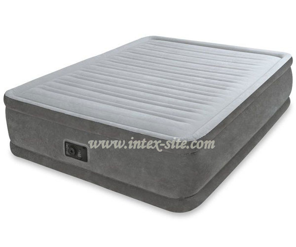 این تخت بادی اینتکس سه لایه بوده و دارای ابعاد طول 191 سانتی متر، عرض 137 سانتی متر و ارتفاع 33 سانتی متر است. تا وزن 275 کیلوگرم را تحمل می کند. جنس بدنه این کالا از نوع پی وی سی با روکش جیر و تمام مخمل بوده و از ویژگی های طبی و همچنین ضد تعرق بودن بهره می برد. ساختار داخلی این تخت از الیاف نخ پلیستر از بالا به پایین است. این الیاف ها باعث افزایش استقامت و حمل بهتر فشار باد در نتیجه سفت تر شدن سطح رویی میگردد. این محصول دارای کیف حمل و نقل است. برچسب تعمیرات و پمپ برقی متصل به تخت است که عمل پر و خالی کردن تخت را انجام میدهد. همچنین این پمپ دارای 18 ماه ضمانت نمایندگی اینتکس میباشد. وزن این تخت بادی 7 کیلوگرم بوده و به دلیل داشتن وزن سبک قابل استفاده در سفر های مختلف نیز می باشد. این تخت در سایز های یک نفره و دو نفره عرض 152 با ارتفاع های مختلف تولید میشود.