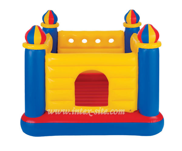 در ساختار قلعه بادی از 4 مناره رنگی در هر 4 گوشه استفاده شده که توسط دیواره های بادی به یکدیگر متصل میشوند، از این رو قلعه بادی محصور است که سبب افزایش ایمنی میشود، از آنجایی که کف محصول با مقاومت بالایی ساخته شده به عنوان جامپینگ بادی نیز استفاده میشود، هنگام پرش و بازی خطری کودک را تهدید نمیکند و دیواره های بادی مانع از خروج کودک از مجموعه بازی میشود، در قسمت جلویی قلعه یک درب برای ورود و خروج به آن تعبیه شده است، ترکیب رنگ این قلعه زرد، آبی و قرمز است که بسیار شاد و زیبا میباشد، ابعاد این محصول بزرگ است و برای بازی و پرش دو کودک همزمان مناسب است. در کف این قلعه بادی ضربه گیر وجود دارد که در فضاهای بسته از ایجاد سر و صدا جلوگیری میکند. قلعه بادی از دریچه های بادی جداگانه باد میشود، این دریچه ها از نوع پستونکی بزرگ است که پر و خالی کردن این محصول را براحتی انجام میدهد، جامپینگ قلعه بادی با انواع پمپ های باد شرکت اینتکس قابل باد شدن میباشد.