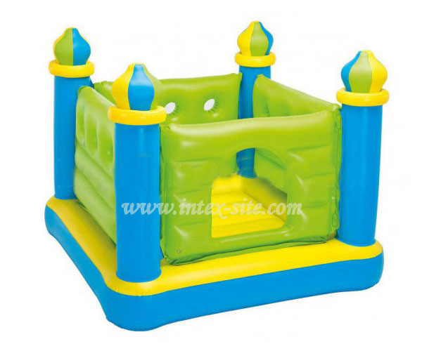 دور تا دور قلعه بادی دارای دیواره های بادی است و در هر چهار گوشه آن مناره هایی وجود دارد، در قسمت جلویی دارای یک درب برای ورود و خروج به داخل قلعه بادی است، از آنجایی که کف محصول از مقاومت بالایی برخوردار است از این محصول به عنوان جامپینگ بادی نیز استفاده میشود، اطراف قلعه با دیواره های بادی محصور است و از خروج احتمالی کودک هنگام بازی و پرش جلوگیری میکند، هم چنین این دیوارها نرم بوده و آسیبی یه کودک وارد نمیکند، از این رو کاملا ایمن است،  با توجه به ابعاد و تحمل وزن این محصول مناسب برای جامپ کردن یک کودک میباشد. در کف این جامپینگ قلعه بادی ضربه گیر تعبیه شده که هنگام بازی کودک در فضای بسته از ایجاد سرو صدا جلوگیری میکند. قلعه بادی از دریچه های بادی جداگانه باد میشود، این دریچه ها از نوع پستونکی بزرگ است که پر و خالی کردن این محصول را براحتی انجام میدهد، جامپینگ قلعه بادی با انواع پمپ های باد شرکت اینتکس قابل باد شدن میباشد.