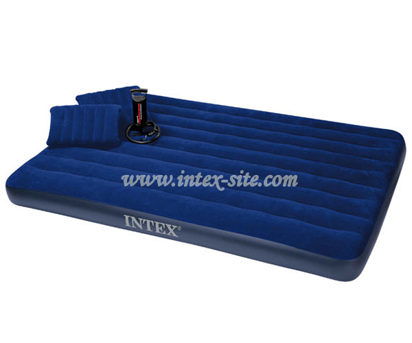 تشک بادی دو نفره اینتکس بطول 203، عرض 152، ارتفاع 22 سانتیمتر تا وزن 273 کیلوگرم را تحمل میکند، با روکش لطیف مخملی ضد تعریق دارای خطوط طولی در سطح تشک و بسیار راحت وزن سبک و قابلیت حمل آسان دارای مناسب استفاده در منزل، محل کار، ویلا، شرکت و مسافرت میباشد. همراه این تشک پمپ باد دستی بوده که در مدت کوتاهی پر و خالی می شود، و دو عدد بالش برای راحتی هر چه بیشتر هنگام خواب میباشد. ساختار داخلی این تشک به صورت موازی می باشد که باعث وارد آمدن کمترین فشار ممکن به ستون فقرات می شود.