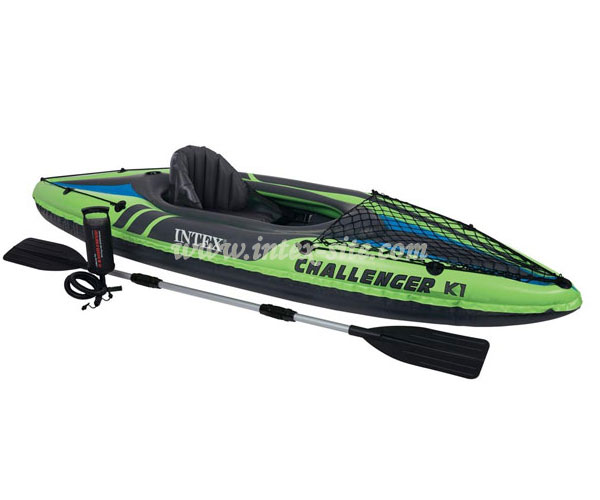 قایق بادی کایاک قابلیت نصب موتور را ندارد و نیروی محرکه آن توسط یک جفت پاروی کایاکی 5 تکه دو طرفه انجام میگیرد. از نظر ظاهری قایق های کایاک دارای طولی کشیده بوده و رنگ آن سبز-مشکی میباشد، یک کوسن با پشتی جهت نشستن فرد دارد. یک توری در قسمت جلویی قایق تعبیه شده که برای نگهداری لوازم قایق ران استفاده میشود. جنس بدنه قایق بادی از پی وی سی چند لایه با کیفیت است، از دریچه های بادی مجزا باد میگردد و این امر موجب حفظ تعادل و ثبات قایق در آب میشود. دریچه های کف و صندلی این قایق یکنفره بادی از نوع پستونکی کوچک و دریچه باد بدنه قایق از نوع پیچی بزرگ است. یک زائده در زیر قایق کار شده که به بهبود هدایت آن، هنگام قایق رانی کمک میکند. این محصول با همین مشخصات در سایز دو نفره نیز تولید میگردد.