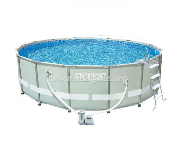 استخر آماده پیش ساخته دایره فریمی اینتکس به قطر 549 و عمق 132 سانتیمتر، وزنی معادل 123.5 کیلوگرم دارد. حجم آب آن 26423 لیتر میباشد. دور تا دور آن پایه های فلزی آلمینیومی قرار دارد. استخر پیش ساخته اینتکس، با رنگ طوسی، همراه با بدنه بسیار مقاوم، از جنس pvc فشرده چند لایه تقویت شده است. پایه ها و لبه ها آهنی، با قابلیت نصب در چند ساعت، دارای دی وی دی آموزشی نصب، دارای دریچه تخلیه آب و رابط تخلیه و آبیاری است. این استخر یکی از بهترین ها برای خرید جهت استفاده خانگی و صنعتی می باشد. این استخر همراه خود پمپ تصفیه آب فیلتر شنی برای تصفیه آب داخل استخر با توان 7.9 لیتر بر ساعت داشته و یک تصفیه حرفه ای انجام میدهد تا آب درون آن در طی استفاده کدر نشود و از کیفیت آن کاسته نشود. به علاوه در مصرف آب نیز صرفه جویی می شود. این استخر همراه خود لوازم جانبی از جمله پمپ تصفیه آب شنی، فشارسنج و تایمر پمپ تصفیه، زیرانداز، روکش، نردبان، دی وی دی آموزشی نصب، و برچسب تعمیرات دارد.