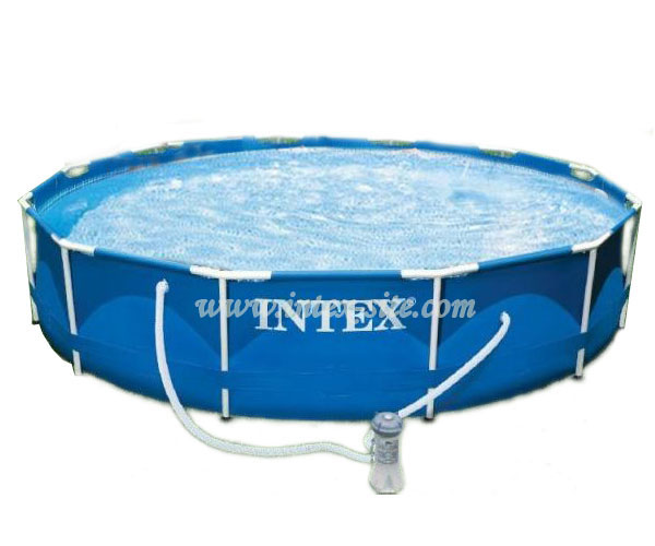 استخر پیش ساخته دایره فریمی اینتکس، به قطر 366 و عمق 76 سانتیمتر، وزنی معادل 27.5 کیلوگرم دارد، حجم آب آن 6503 لیتر میباشد، دور تا دور آن پایه های فلزی آلمینیومی قرار دارد، مناسب برای استفاده بزرگسالان و کودکان، در منزل، جنس بدنه از پی وی سی الیافدار، دارای طراحی داخلی کاشی کوچک، از بیرون آبی یکدست که لوگوی اینتکس روی آن به چشم میخورد، مقاوم در برابر فشار آب، استخر فریمی اینتکس بسیار زیباست و ظرفیت آب آن هم در حد استاندارد می باشد که در مدت زمان پر شدن آن تاثیر مستقیم دارد. یعنی چون ظرفیت این استخر متوسط بوده زمان کمتری احتیاج دارد تا پر شود. به علاوه جنس آن هم بسیار خوب است و یکی از بهترین و به صرفه ترین استخر های پیش ساخته اینتکس می باشد. همراه این استخر یک پمپ تصفیه فیلتر کاغذی، با توان 3785 لیتر بر ساعت، برچسب تعمیرات و دی وی دی آموزشی میباشد.